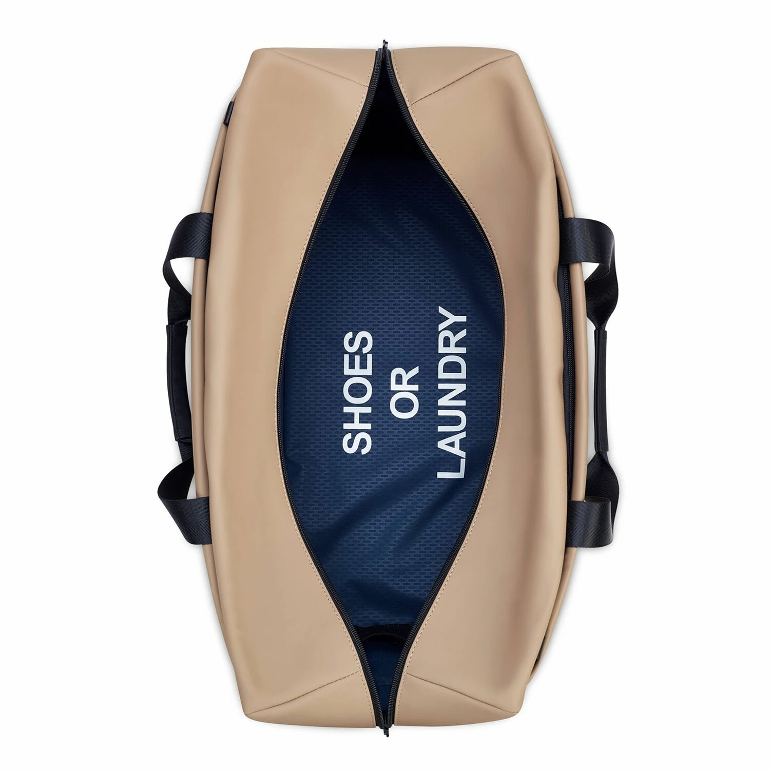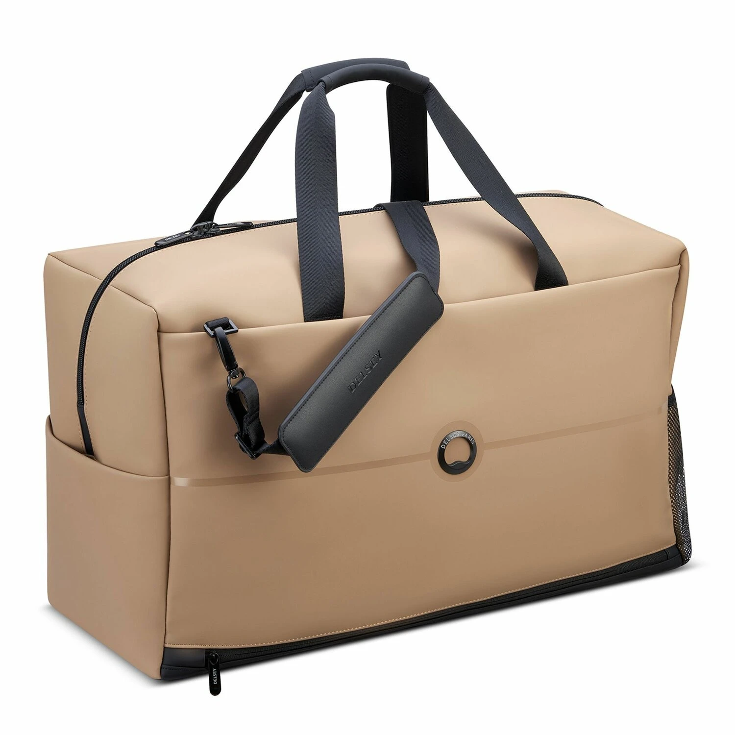 Amplia bolsa de viaje de Delsey. El material exterior y el forro son impermeables y tienen un gran espacio de almacenamiento. También se fabrica a partir de botellas de PET recicladas. El compañero perfecto para cualquiera que quiera viajar de forma responsable y cómoda.