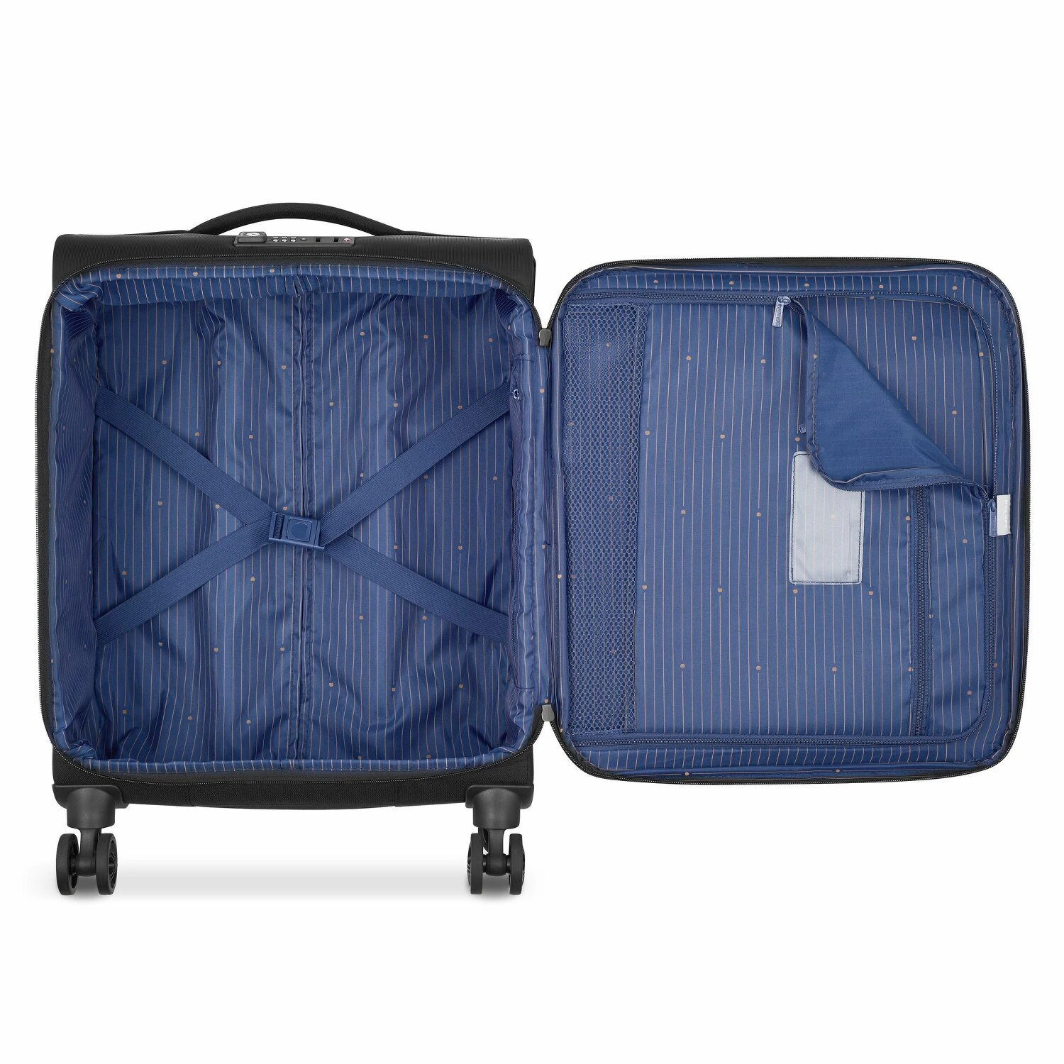 Robusto trolley de Delsey fabricado en resistente poliéster. El espacioso compartimento principal ofrece mucho espacio y está bien organizado gracias al separador de espacio. Con 4 ruedas de fácil desplazamiento, la maleta es especialmente flexible y puede empujarse cómodamente en todas direcciones.
