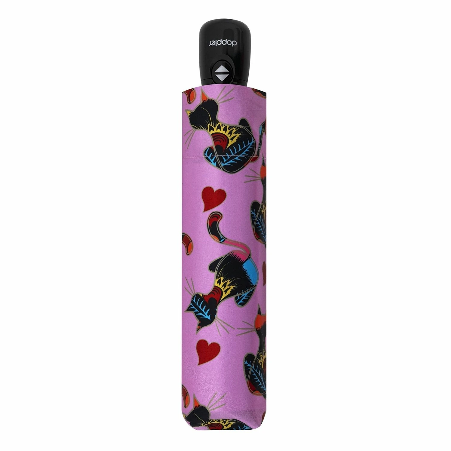 El paraguas de bolsillo Fiber Magic de Doppler se abre automáticamente. El gran techo de paraguas, con sus ocho elementos, repele el agua y soporta enormes cargas de viento. El diseño especial hace que el paraguas llame la atención.