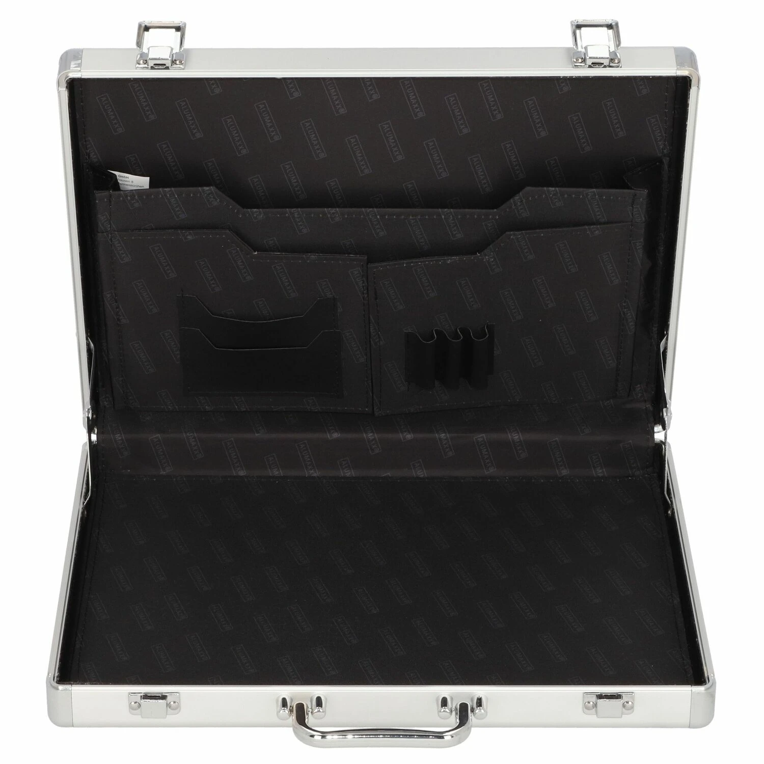 Elegante maletín de Alumaxx fabricado en aluminio robusto con mucho espacio para documentos A4, carpetas de archivos y todo tipo de utensilios de trabajo, como bolígrafos, cuaderno, smartphone, tableta y tarjetas de crédito.