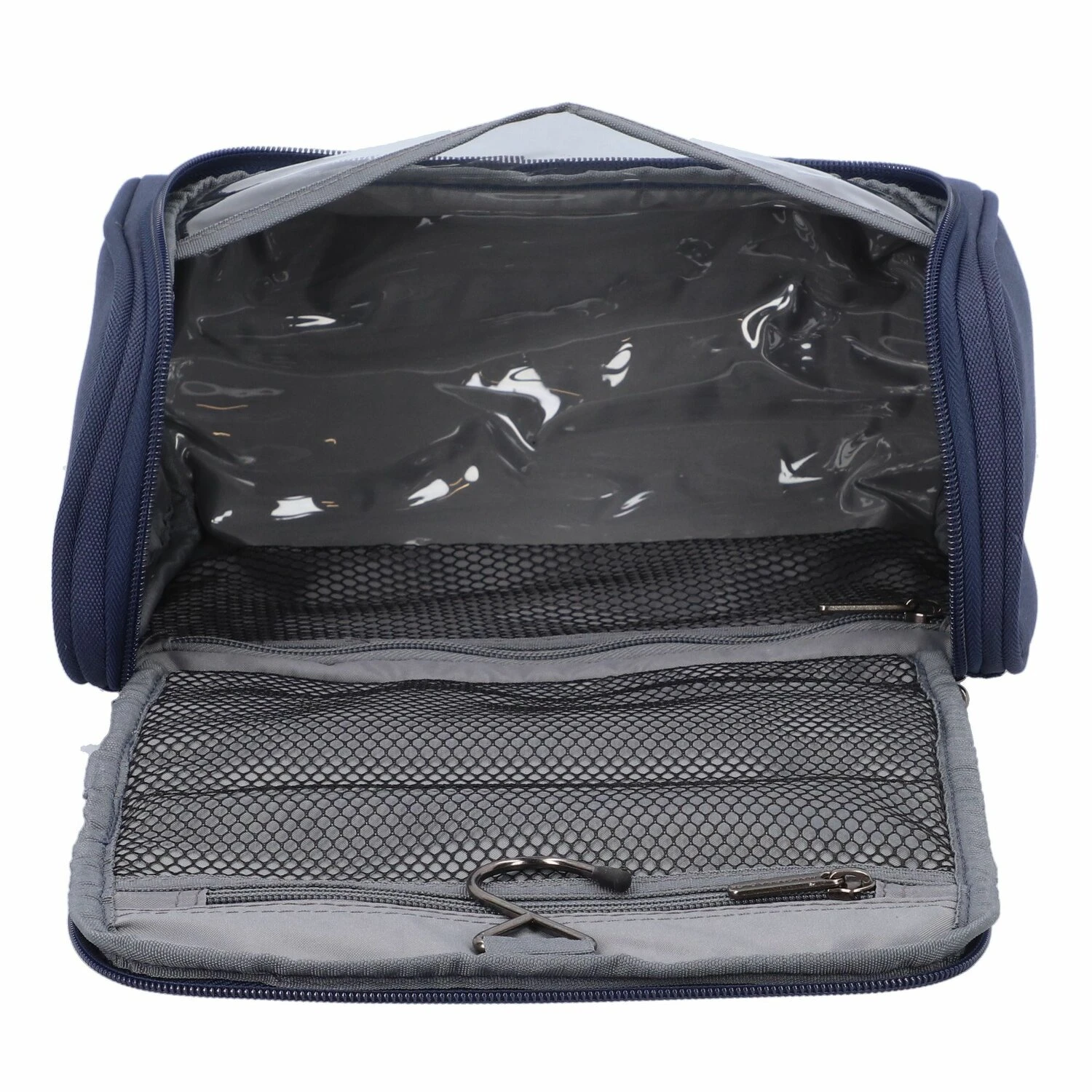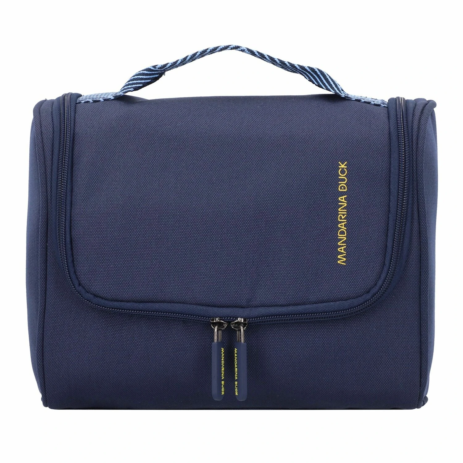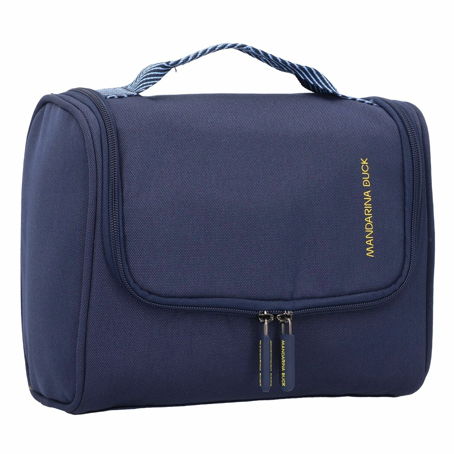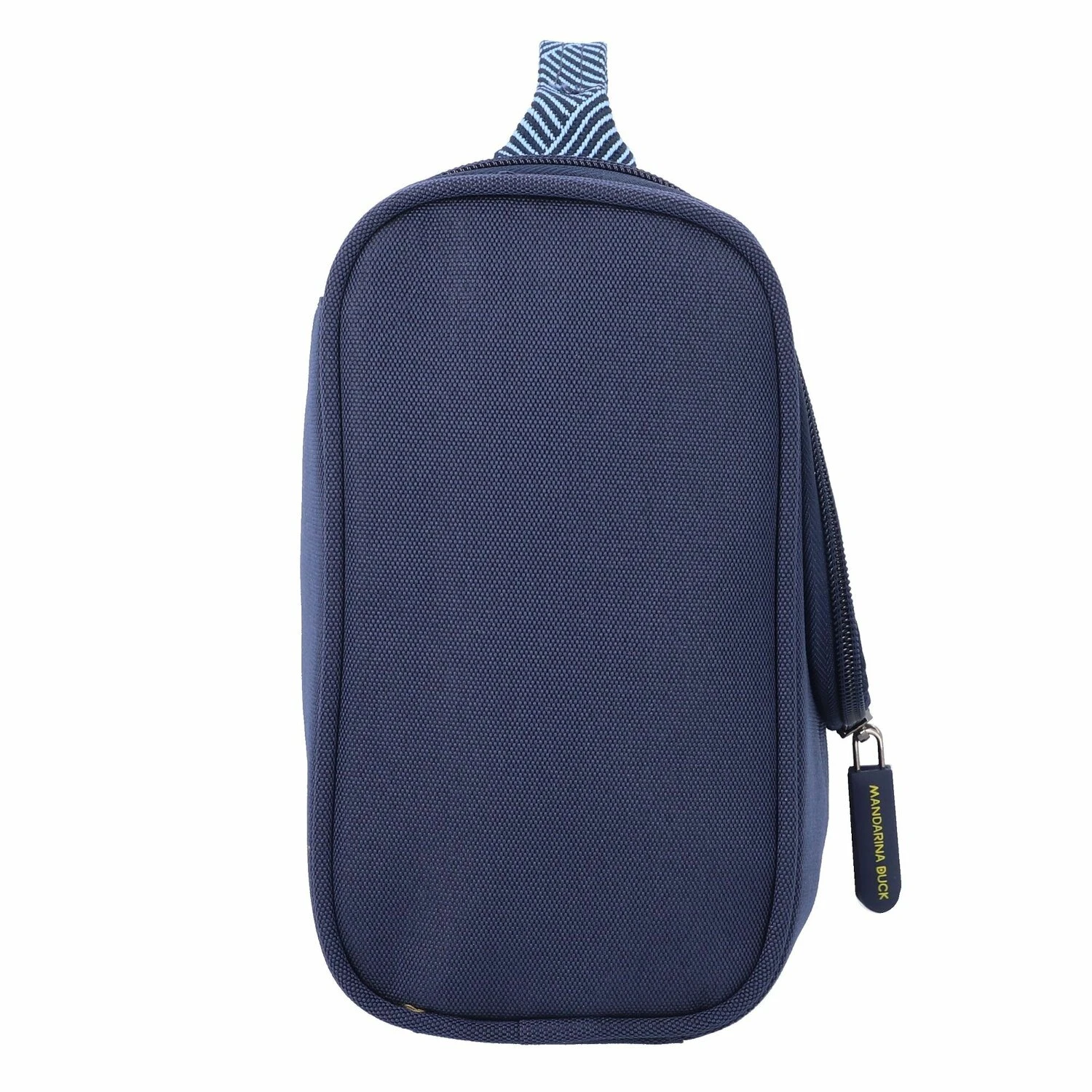 Práctico neceser de Mandarina Duck fabricado en poliéster resistente. La bolsa tiene un amplio compartimento principal con bolsillos de malla y un gancho para colgarla en el interior. Un compañero útil para todo tipo de viajes.
