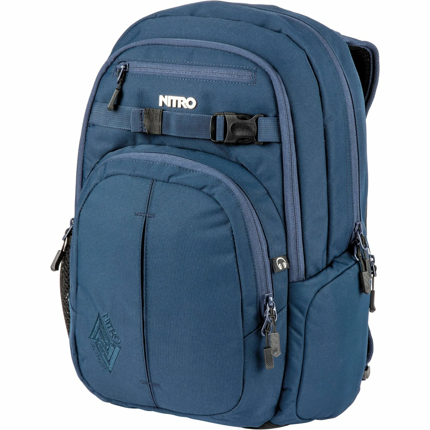 La mochila grande y práctica de Nitro, fabricada en material duradero, ofrece mucho espacio y una visión óptima gracias a sus numerosos bolsillos y compartimentos. Dispone de dos compartimentos principales, un compartimento independiente acolchado con espacio para portátiles con una diagonal de pantalla de hasta aprox. 43 cm (17 pulgadas), un compartimento con forro polar para gafas de sol o smartphone, un compartimento de malla para botellas y un bolsillo frontal con organizador y salida para auriculares. Las correas acolchadas para los hombros y el sistema de respaldo ergonómico permiten llevarla cómodamente incluso con mucho peso. La correa de pecho ajustable asegura adicionalmente la mochila. El compañero perfecto para el día a día o para viajar.