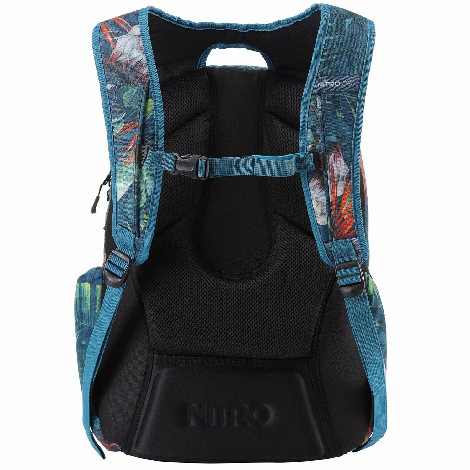 La práctica mochila de Nitro dispone de dos compartimentos principales, un compartimento acolchado con espacio para portátiles con una diagonal de pantalla de hasta 43 cm (17 pulgadas) aproximadamente, un compartimento para tabletas acolchado, un bolsillo frontal con organizador y salida para auriculares, un compartimento de malla para botellas, así como otros numerosos compartimentos y bolsillos, y ofrece así mucho espacio de almacenamiento para guardar todo lo necesario para el uso diario. Las correas acolchadas para los hombros y el sistema de respaldo con forma ergonómica hacen que sea cómodo de llevar, incluso con mucho peso. La correa de pecho ajustable asegura adicionalmente la mochila. El compañero ideal para casi cualquier ocasión.