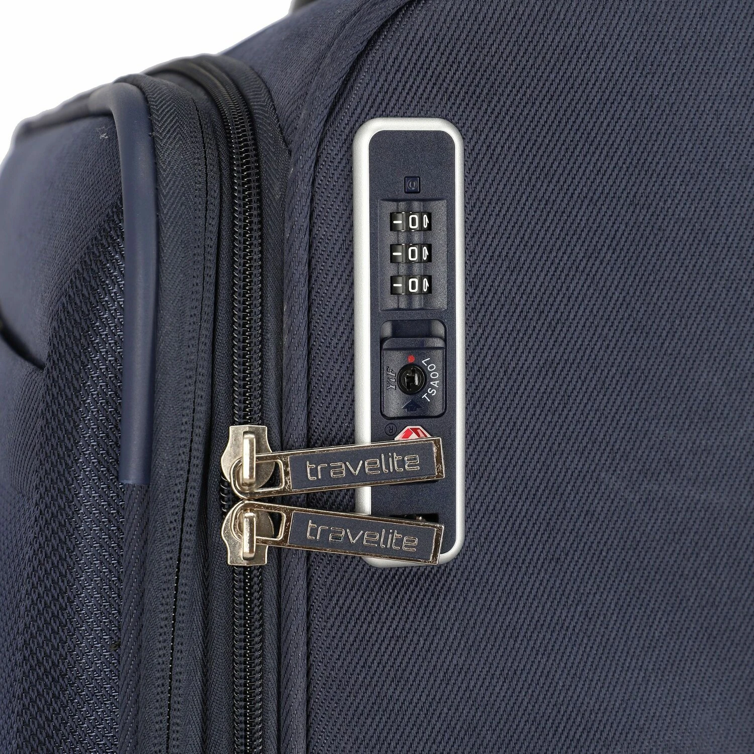 El elegante trolley de cabina de Travelite está fabricado con tejido de poliéster reciclado y tiene una muy buena separación interior. Las estables y silenciosas ruedas dobles y la cerradura TSA integrada distinguen a esta elegante maleta.